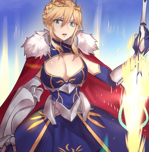 cleavage dress fate_grand_order horns nayamer no_bra saber saber_(fate_prototype) saber_alter sword weapon.jpg)