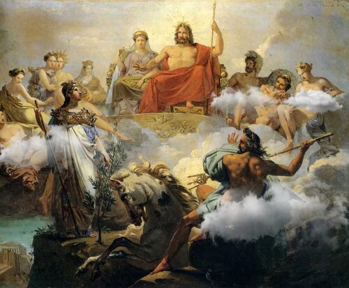 Зевс, верховный бог Олимпа, был богом грома, молний и неба. Он изображался как властный мужчина с молнией в руке и был известен своей силой и мудростью.